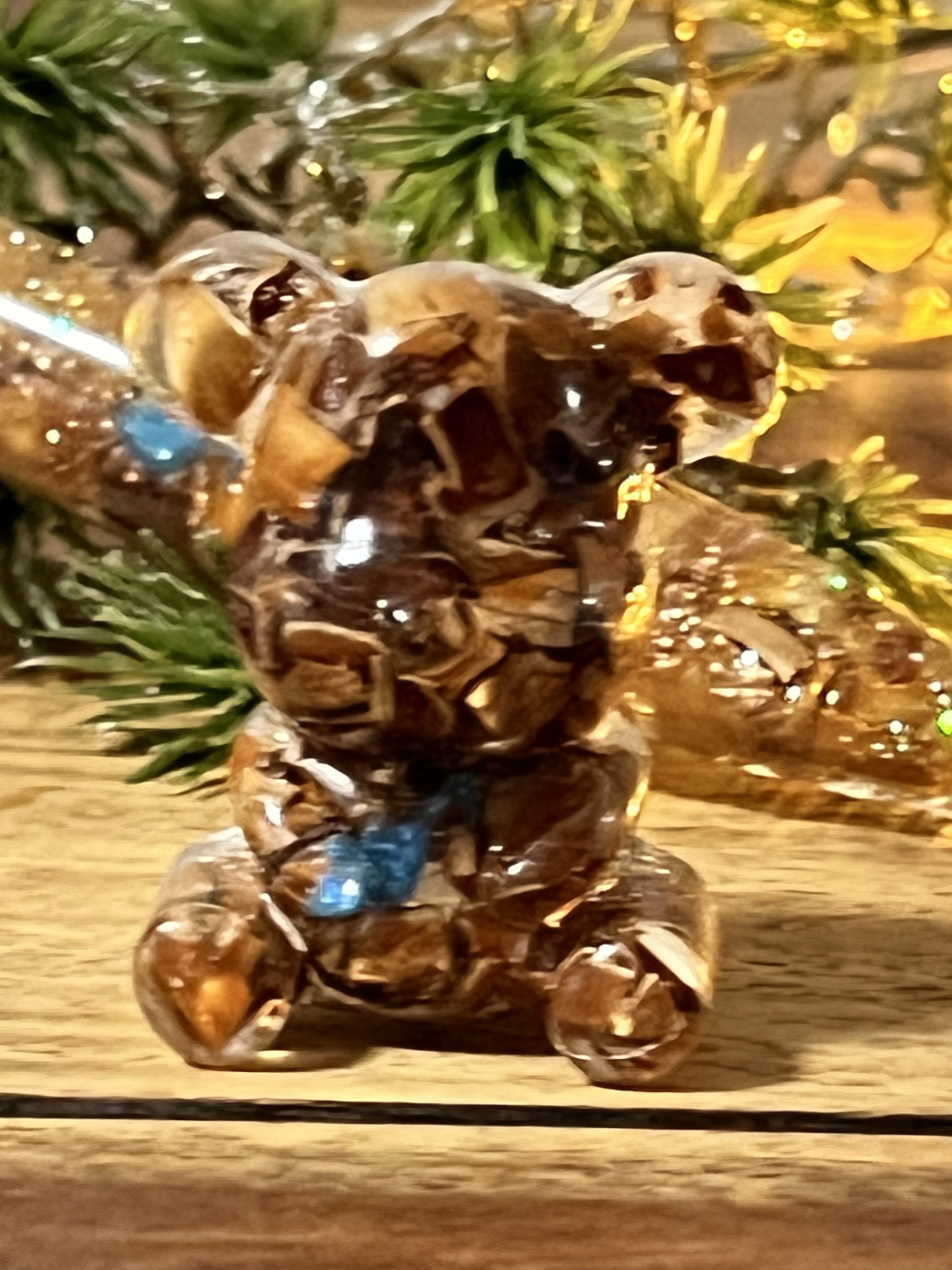 Das zweite Design ist ein handgegossener Resin Teddybär, der im Inneren kleine Haselnussstücke, goldene Akzente und einen zarten Gold Glitzer Schuh bewahrt. Jedes Detail schimmert im Licht und erzählt seine eigene kleine Geschichte. In beiden Varianten steht der wunscherfüllende Haselnuss Anhänger im Fokus, umgeben von einem Hauch märchenhafter Energie.🪄🎄💫
