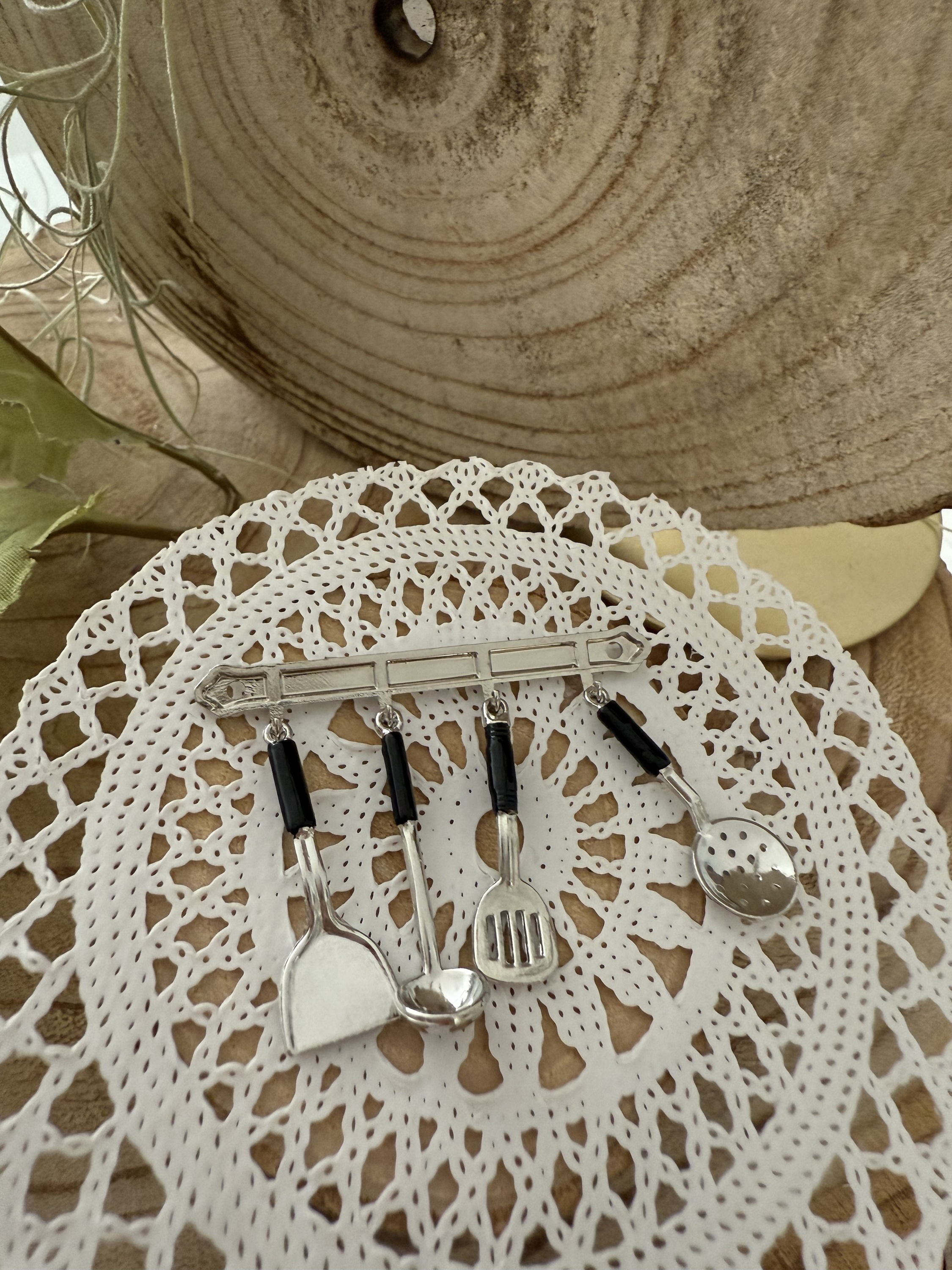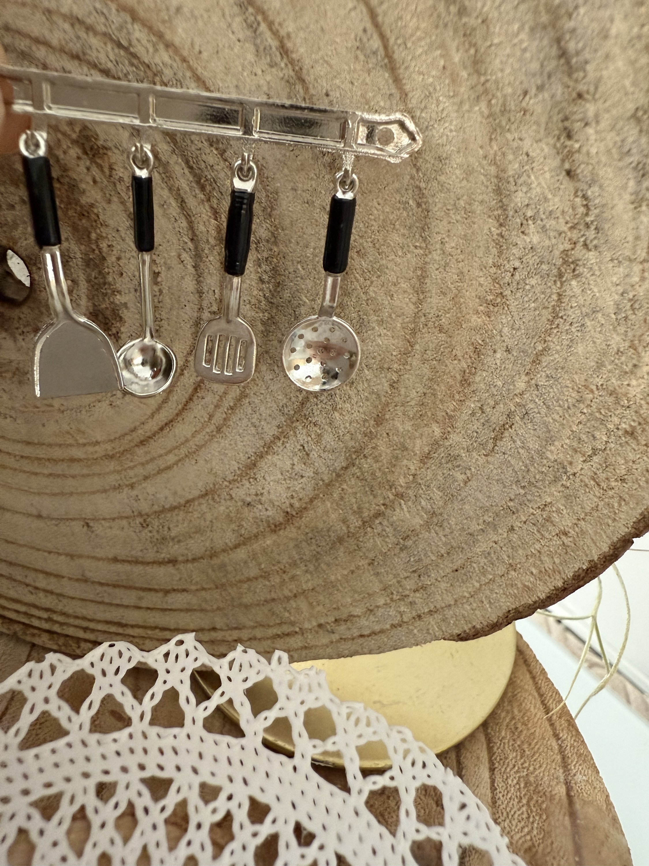 Dieses Set besteht aus vier detailgetreuen Küchenutensilien: einem Pfannenwender, einer Schöpfkelle, einem Bratlöffel und einem Schaumlöffel, alle an einer eleganten Leiste aufgehängt. Die silberne Oberfläche mit schwarzen Griffen verleiht dem Set ein zeitgemäßes und elegantes Design, ideal für moderne Miniaturküchen oder Puppenhäuser.